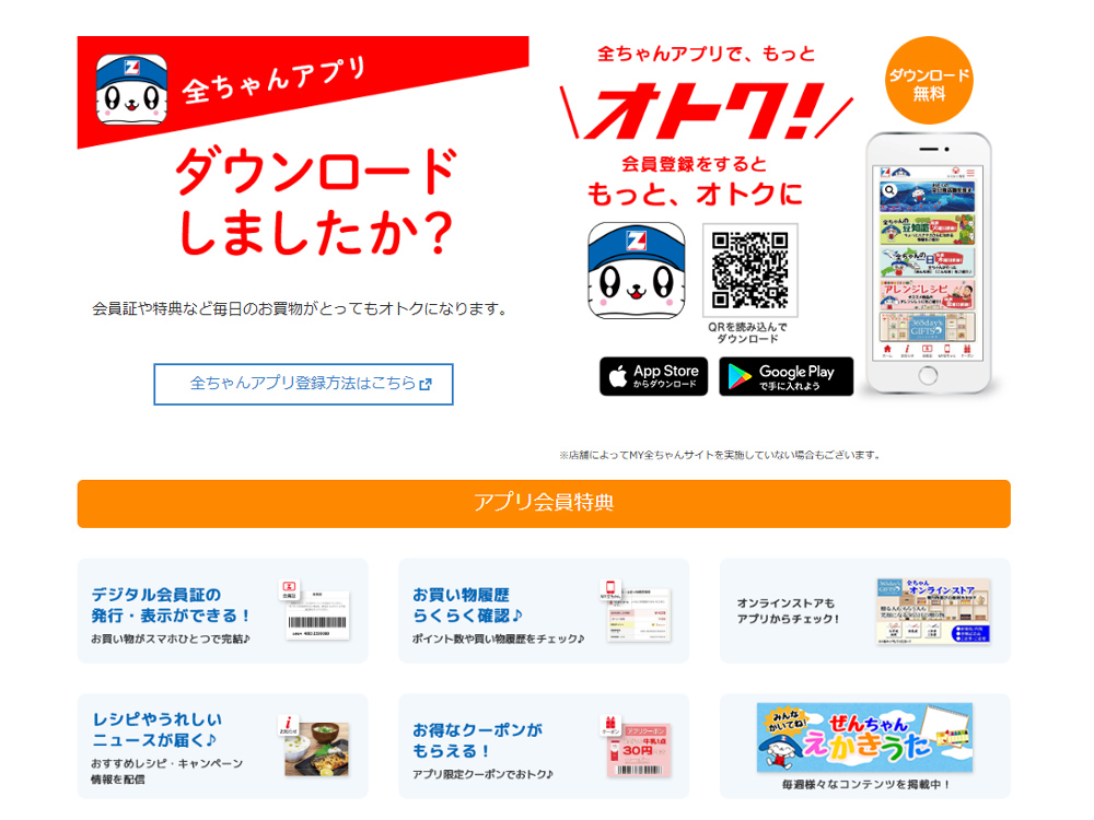 公式キャラクター「全ちゃん」のコーナーもあり、全体的にアプリのデザインがレトロで懐かしい感じがするのが楽しいです。